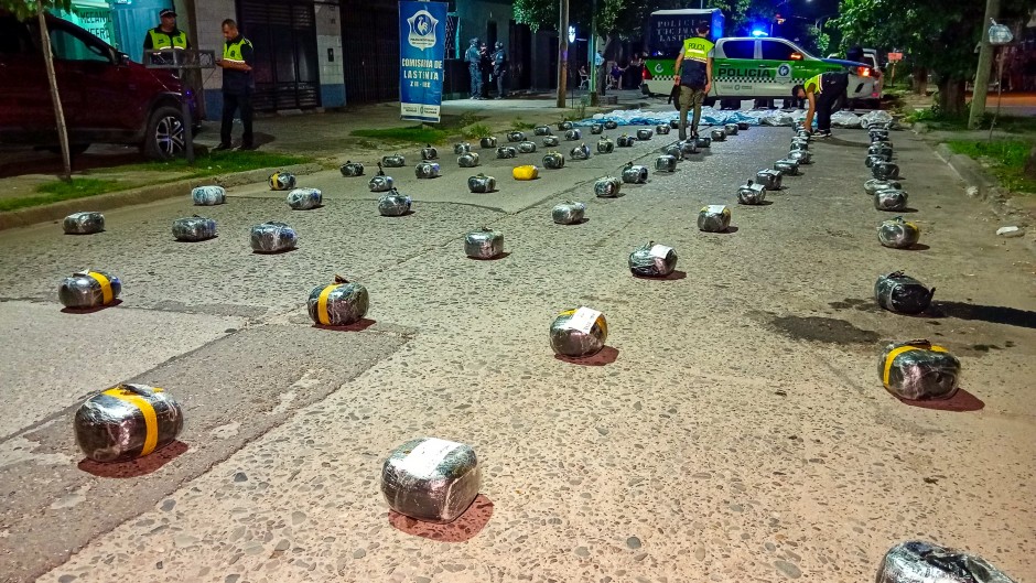 Según detallaron las autoridades, el allanamiento se llevó a cabo en una vivienda ubicada en calle San Juan al 1800, a partir de una causa iniciada por amenazas agravadas. En el lugar se hallaron 79 envoltorios de marihuana ocultos en bolsas de arpillera, con un peso total cercano a los 146 kilos, confirmados tras las pruebas de campo realizadas por personal especializado.